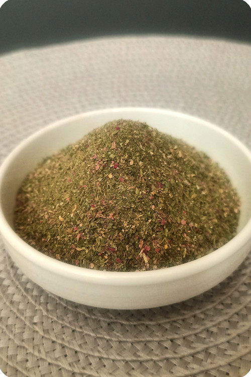 مواد تشکیل دهنده این چاشنی خوش عطر و خاص شامل گیاهان معطری چون نعناع، کاکوتی یا آنخ، آویشن، ترخون، شوید و ادویه هایی چون تخم گشنیز فلفل سیاه پودر سیر و گلهای خوش عطر غنچه گل محمدی و .... می باشد.